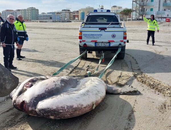 A Cesena, sulla spiaggia di Valverde è stato rinvenuto il corpo spiaggiato di un Pesce Luna dal peso eccezionale di 1000 kg, stabilendo così un nuovo record sulla costa romagnola. Il sindaco di Cesenatico, Matteo Gozzoli, ha condiviso su Facebook le immagini del ritrovamento e ha ringraziato i tecnici comunali, i volontari di Radio Soccorso Cesenatico, il Centro Sub ‘Roberto Zocca’ e la ditta ‘Amici animali’ di Ravenna per la collaborazione nella rimozione della carcassa dell’animale gigante.