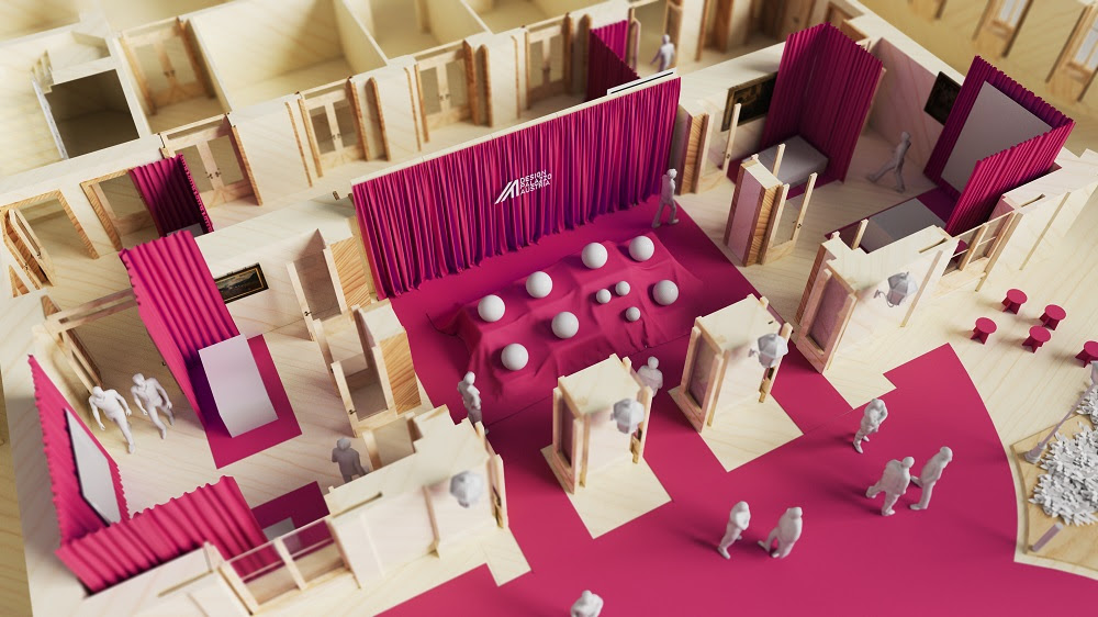 La mostra si sviluppa su due piani: il percorso inizia al piano terra, dove i prodotti si pongono immediatamente come centro focale grazie all’impatto visivo della scenografia color porpora, per poi proseguire al primo piano, dove i visitatori saranno accolti dal medesimo filo conduttore, il tutto avvolto da luci soffuse. Ogni ambiente si trasforma in un microcosmo unico, un gioco di colori, stili e materiali.