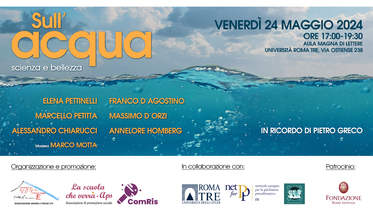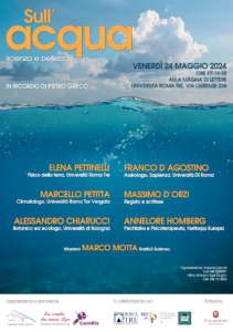 Venerdì 24 maggio alle ore 17.00, l’Aula Magna di Lettere presso l’Università Roma Tre ospiterà un evento per gli appassionati di scienza, arte e cultura: “SULL’ACQUA. SCIENZA E BELLEZZA”, un incontro dedicato alla memoria dello scrittore e giornalista Pietro Greco, figura di spicco nella divulgazione scientifica in Italia. L’evento è organizzato dal Master ComRis (Comunicazione della scienza e della Ricerca scientifica), diretto dalla Prof.ssa Elena Pettinelli del Dipartimento di Matematica e Fisica dell’Università Roma Tre, in collaborazione con l’Associazione culturale Amore e Psiche e l’Associazione di promozione sociale La Scuola che verrà.