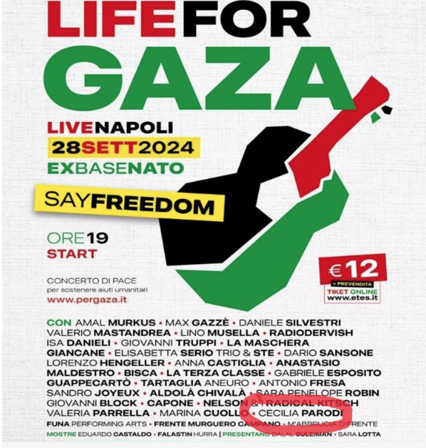 Il prossimo 28 settembre, l’ex base Nato di Napoli ospiterà l’evento ‘Life for Gaza’, un “concerto di pace” che vedrà la partecipazione di vari artisti, tra cui Max Gazzè, Daniele Silvestri, Valerio Mastandrea, Isa Danieli e Giovanni Truppi, che si esibiranno per sostenere gli aiuti umanitari a Gaza.