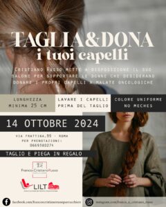 Partecipando a questa iniziativa di solidarietà, oltre a donare i capelli, si riceverà in omaggio un nuovo taglio e una piega. I capelli raccolti verranno consegnati alla LILT, Lega Italiana per la Lotta contro i Tumori, per sostenere le donne che affrontano la sfida della perdita dei capelli durante il percorso di guarigione.