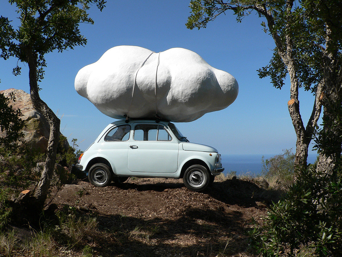 Le nuvole, associate al modello storico dell’automobile Fiat 500, un’icona senza tempo, assumono un ruolo particolare. L’auto del popolo, simbolo di accessibilità per tutti e rappresentante di un’epoca e uno stile di vita, si trasforma in una scultura gigante. Una Fiat 500 modello D color crema del 1964 trasporta su di sé, al posto delle valigie, una nuvola dalle dimensioni irreali. L’opera Nuvola evoca un’Italia nostalgica, speranzosa e fatta di sogni collettivi, un immaginario che appartiene al passato ma non così lontano. Declinata in diverse versioni, la Nuvola ha viaggiato per il mondo facendo tappa in piazze e luoghi iconici, diffondendo il fascino dell’Italia del boom economico. Le nuvole, come racconta l’artista, sono forse tra le prime immagini che impariamo a disegnare da bambini insieme alle casette e al sole, richiamando quella dimensione di leggerezza e spensieratezza che accompagna l’infanzia e che l’arte è in grado di restituire allo sguardo adulto.