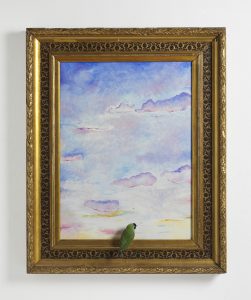Tra le molte varianti pittoriche realizzate, c’è la serie degli inediti “Cieli Bucati”. Qui, le nuvole si stagliano in orizzonti che mutano dalle tonalità del rosa, azzurro, viola dell’alba, al rosso fuoco del tramonto, vibrando sotto il passaggio della luce come nei dipinti en plein air di Monet. La tela, bucata e picchiettata, supera il limite dello spazio pittorico aprendo nuove dimensioni. Un piccolo volatile si posa sulla cornice (di vecchia manifattura recuperata dall’artista) creando un collegamento tra passato e presente. La serie dei “Cieli Bucati” richiama le costellazioni dei “buchi” di Lucio Fontana, verso quelle aperture di uno spazio ulteriore alla ricerca della terza dimensione, ma anche al romanzo dello stesso Gabriele Picco “Cosa ti cade dagli occhi” (2010), in cui un gabbiano scopre il tallone d’Achille del cielo: un punto fragile che, se colpito con il becco, potrebbe frantumarsi, aprendo un piccolo spiraglio sulla meraviglia dell’ignoto. Questo gesto simbolico rappresenta la capacità di trasformare la realtà e trovare quella crepa attraverso cui accedere a un mondo idealizzato.