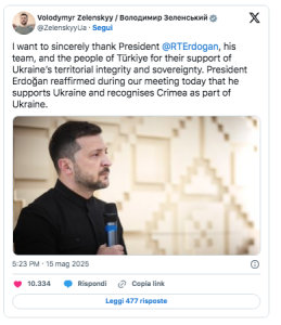 Zelensky ha comunque visitato Ankara, dove ha incontrato il presidente turco Recep Tayyip Erdogan. Durante il colloquio di quasi tre ore, Erdogan ha sottolineato la necessità di una pace giusta e ha offerto di ospitare un incontro diretto tra Zelensky e Putin “quando saranno pronti”. Il presidente ucraino ha ribadito il sostegno turco al riconoscimento della Crimea e degli altri territori occupati come parte dell’Ucraina, un punto su cui Zelensky è fermamente deciso a non cedere.