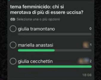Un episodio inquietante si è verificato in una chat di classe di un istituto superiore a Bassano del Grappa, in provincia di Vicenza. È emerso un sondaggio macabro in cui gli studenti sono stati invitati a scegliere tra tre donne: Giulia Cecchettin, Mariella Anastasi e Giulia Tramontano, con la domanda provocatoria: “Chi si meritava di più di essere uccisa?”. Questo caso è stato reso noto dall’associazione Women for Freedom, attiva nella difesa di donne e bambini in situazioni di emergenza.