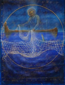La tela si sviluppa su uno sfondo azzurro, dove mare e cielo si fondono. Al centro, San Pietro è rappresentato come un marinaio che getta le reti, simbolo della fede e dell’umanità. I suoi gesti si intrecciano con trame invisibili e coordinate geografiche, formando una rete che simboleggia un mondo fragile ma ancora navigabile, unito da un compito di salvezza.