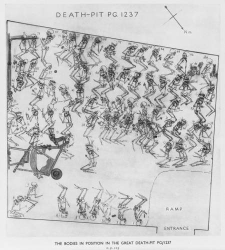 La particolare tomba rivelò che ben tre arpe erano state suonate mentre la sepoltura veniva sigillata, portando alla morte per soffocamento di tutti e 74 i presenti. Tra di loro, una giovane ragazza fu trovata stringendo il suo nastro dorato, forse giunta troppo tardi per sistemare i suoi gioielli o colta da un terrore inimmaginabile.