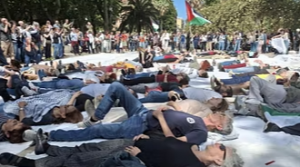 A Roma, la protesta si è svolta nella centrale piazza Vittorio, dove bandiere palestinesi sventolavano mentre i partecipanti si sdraiavano sui lenzuoli bianchi, rendendo visibile la loro solidarietà.