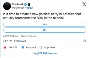 In risposta a questo scontro, Musk ha lanciato un sondaggio su X, chiedendo ai suoi oltre 200 milioni di follower se fosse il momento di creare un nuovo partito politico in America che rappresenti effettivamente l’80% della popolazione. Questo post è stato pubblicato subito dopo le critiche di Trump riguardo alla legge fiscale, che per Musk è un “disgustoso abominio” destinato ad aggravare il debito pubblico degli Stati Uniti.