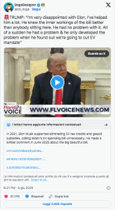 In seguito, Musk ha smentito Trump, affermando che il disegno di legge fiscale non gli era mai stato mostrato e che era stato approvato in fretta durante la notte, senza che quasi nessuno al Congresso avesse avuto la possibilità di leggerlo.