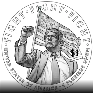 Il Dollaro di Trump con il pugno alzato e il motto “Fight, Fight, Fight”