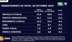 Nel quadro politico italiano, la nuova rilevazione condotta dall’istituto SWG per La7 restituisce un panorama segnato da continuità al vertice, ma con dinamiche interne in rapido mutamento. Sebbene la lettura analitica risulti complicata da un recente rallentamento nelle pubblicazioni ufficiali, l’elaborazione dei principali dati disponibili (aggiornamenti fino ai primi di ottobre) consente di delineare alcune tendenze significative.