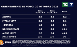 Aggiornamento al 20 ottobre 2025, in testa ancora il centro‑destra, sinistra in stallo