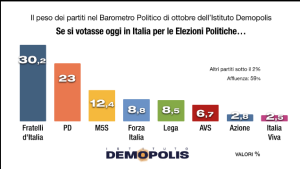 Secondo le rilevazioni più recenti, il soggetto dominante risulta essere Fratelli d’Italia (FdI), attestatosi stabilmente oltre la soglia del 30 % nelle ultime rilevazioni, con un aumento costante rispetto ai mesi precedenti.