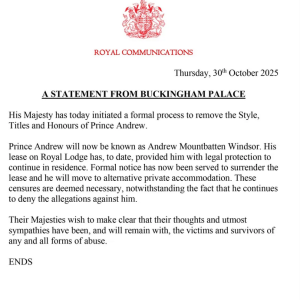 La notizia è stata resa pubblica in un comunicato ufficiale diramato da Buckingham Palace il 30 ottobre 2025: il sovrano, Re Carlo III, ha “today initiated a formal process to remove the Style, Titles and Honours of Prince Andrew” e ha annunciato che Andrea “will now be known as Andrew Mountbatten-Windsor”. Al contempo, è stato dichiarato che “formal notice has now been served to surrender the lease” della Royal Lodge.