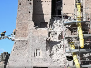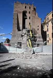 Per capire la portata dell’accaduto è necessario ripercorrere la storia dell’edificio. La torre si innalza su fondazioni e strutture che affondano nell’antico sostrato dell’area dei Fori: un territorio stratificato dove resti antichi, riutilizzi medievali e interventi moderni si sovrappongono in modo complicatissimo. Nei secoli la Torre dei Conti ha funzionato ora come presidio, ora come simbolo medievale, subendo smantellamenti, rimaneggiamenti e ricostruzioni: la sua stessa fisionomia è l’esito visibile di eventi tellurici e di campagne di spoliazione che hanno inciso sulle superfici murarie.