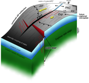Secondo le recenti ricerche, una delle placche oceaniche – la Juan de Fuca Plate – che scorre sotto la placca nordamericana, starebbe subendo una lacerazione interna: i dati mostrano una faglia continua che si estende per decine di chilometri, con un salto verticale stimato in circa 5 km in alcune porzioni.