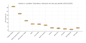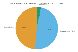 Questa fotografia fornisce la base per i grafici allegati: il grafico “a candela” mostra la distribuzione per singoli partiti, il grafico a torta offre una sintesi per grandi raggruppamenti/coalizioni (centro-destra vs centrosinistra + M5S vs altri).
