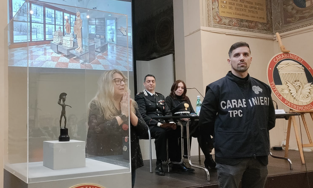 Dopo oltre 60 anni, grazie alla collaborazione internazionale tra il Comando Carabinieri Tutela Patrimonio Culturale, la Homeland Security Investigations e l’Ufficio del Procuratore di New York, una rara statuetta in bronzo raffigurante un guerriero etrusco torna al Museo Civico Archeologico di Bologna, recuperata dagli Stati Uniti e restituita per la fruizione pubblica.