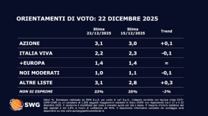 La fine dell’anno porta con sé tradizionalmente un appuntamento fisso per l’informazione politica italiana: l’aggiornamento delle intenzioni di voto degli italiani, elaborato da SWG per il TgLa7 Dai grandi partiti alle coalizioni, il quadro riflette una scena politica ancora contraddistinta da scarsa mobilità elettorale, ma con segnali di tensioni tra le principali forze in campo.