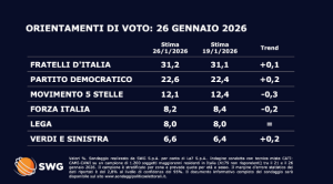Secondo la rilevazione di Swg per il TG La7, le intenzioni di voto mostrano alcuni movimenti rispetto alla settimana precedente: Fratelli dâItalia si conferma primo partito italiano con oltre il 31%, seguito dal Partito Democratico che si porta oltre il 22%. Il Movimento 5 Stelle registra una flessione al 12,1%, mentre dentro il centrodestra Lega mantiene lâ8% e Forza Italia arretra intorno allâ8,2%.