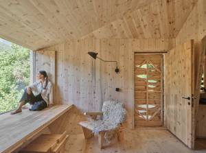 Immagini della Forestone Cabin nei Pirenei: un rifugio ecologico costruito con legno locale e tecniche sostenibili che si integra con il paesaggio montano.