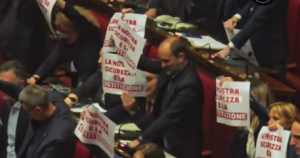Il momento più simbolico della seduta è stato quello della protesta dell’opposizione, che ha intonato “Bella ciao” durante le fasi finali del dibattito.